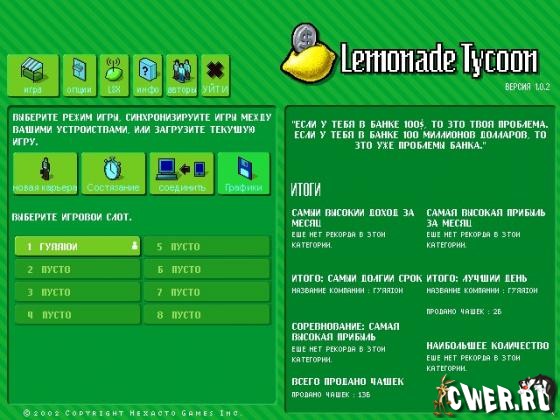 Проверьте свое мастерство предпринимателя: сможете ли вы развить маленький торговый лоток в целую бизнес-империю? Выберите подходящее место для розничной торговли прохладительными напитками, изобретите лучший рецепт лимонада и установите цену, а также не забудьте просмотреть последний прогноз погоды.