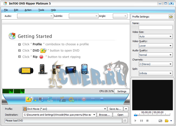 ImTOO DVD Ripper Platinum - это мощная утилита для копирования DVD, которая поможет Вам быстро преобразовать DVD в любой формат видео файлов. Программа совмещает функции DVD- риппера и DVD- аудиориппера, т.е. она сможет конвертировать DVD во все популярные форматы видео, такие как AVI, MPEG, WMV, DivX, RM, MOV, MP4, 3GP, 3G2, Xvid, ASF и т.п. и популярные аудио форматы - MP3, WAV, WMA, AAC, AC3, M4A, MP2, OGG. Поддерживает конвертацию для iPod, мобильных телефонов, PSP, DVD, MP3 и MP4 плееров.