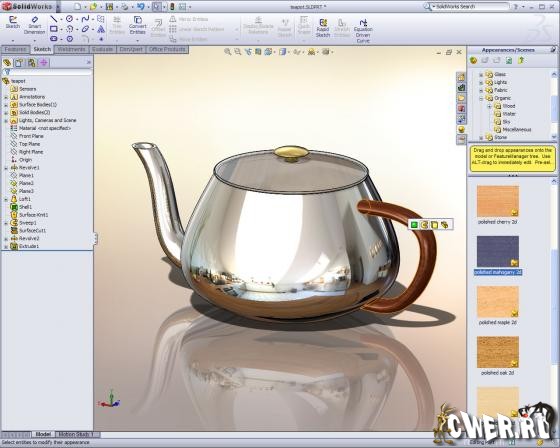 - Симуляция (CAE модуль в SW 2009 (бывший Cosmos)) – опции оптимизации решений, которые позволят изменить размер детали основанной на определенных свойствах.