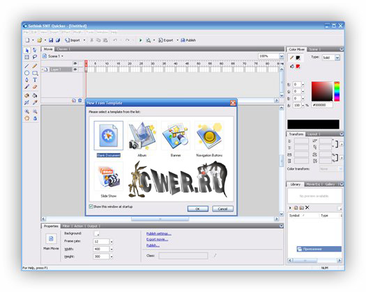 Sothink SWF Quicker - мощное приложение для редактирования и создания Flash роликов в формате SWF для вебсайтов. С помощью этой программы вы сможете создавать флэш-игры, ролики, анимационные динамические баннеры для ваших сайтов, текстовые эффекты, веб-альбомы, слайдшоу презентации и многое другое. Для новичков программа предлагает быстрое создание флэш-анимации с помощью Мастера создания нового проекта с выбором типа и шаблона для вашего проекта. Редактор программы предоставляет возможности для редактирования всех элементов во флэш-видео, например, добавление или изменение текста, замена форм или звуков, назначение ссылок и т.д. К каждому объекту флэш-сцены вы сможете применить встроенные в программу эффекты перехода или появления объекта. Возможно, для вас эта программа сможет стать заменой приложению Adobe Flash, т.к. обладает простым и легким в понимании и использовании интерфейсом.