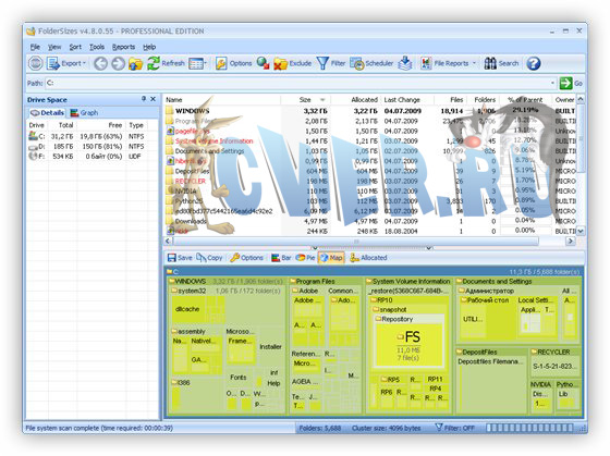 Эта программа позволит вам провести проверку жестких дисков на наличие на них свободного места. Если вы никак не можете понять, почему места осталось так мало, запустите FolderSizes, и программа создаст для вас полный отчет. Программа сгенерирует диаграммы, которые наглядно покажет, какие папки занимают больше всего места.