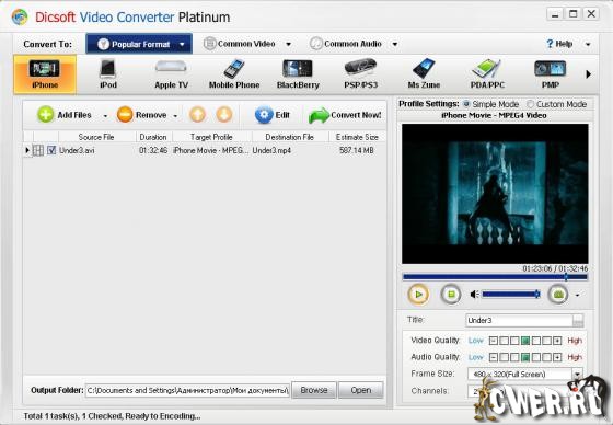 У меня конвертит, что бы запустить конвертирование, выбираете на панели IPod, IPhonе, Mobile Phone и т.д. нажимаете на нужную Вам кнопку (IPod, IPhonе, Mobile Phone...), выбираете из меню нужный Вам формат, далее в окне просмотра запускаете просмотр и, далее Convert Now! После чего появляется окно с процессом конвертирования.