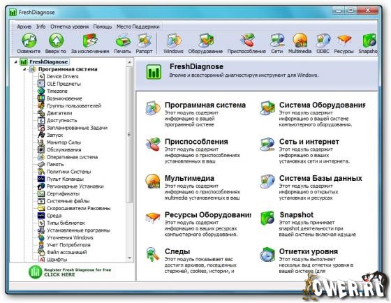 Fresh Diagnose детально изучит все компоненты вашей системы и выдаст подробную информацию, которую можно сохранить в различных форматах (TXT, HTML, DOC). Интересной функцией в этой программе является сравнение данных вашего компьютера с эталонными данными других систем. Все результаты выводятся в наглядной и удобной форме. Программа содержит тесты производительности (benchmarks) для процессора, видеокарты, жёстких дисков, оперативной памяти и других устройств. Утилита хоть и бесплатна, но требует регистрации на сайте производителя. После регистрации на ваш адрес электронной почты придет код, которым нужно произвести активизацию программы.
