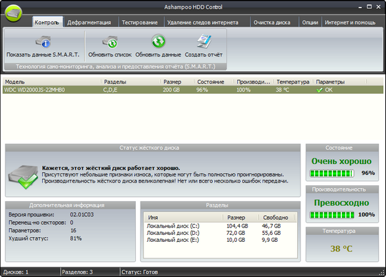 Ashampoo HDD Control - программное обеспечение для контроля за состоянием Вашего жесткого диска. Выполняет обслуживание жесткого диска для Вас. Позволяет предотвратить потенциальные отказы и аварии прежде, чем они произойдут. Программное обеспечение поддерживает жёсткие диски типа IDE и последовательные ATA. Ashampoo HDD Control предоставляет пользователю все важные факты и информацию о дисководе, включая регистрационный номер, версию БИОСА (прошивки), размер кэша, количество разделов, на которые разбит хард, свободном месте на диске и текущей температуре.