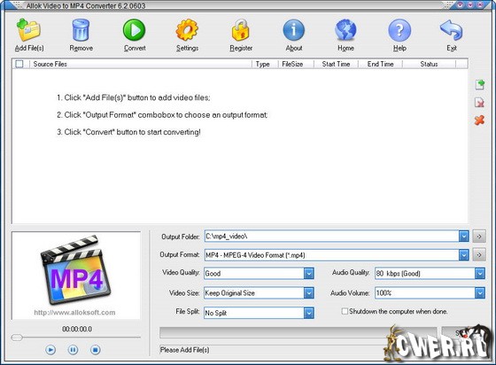 Allok Video to MP4 Converter - конвертер видео файлов различных форматов в MP4 формат. Особенности: поддержка DivX, XviD, AVI, WMV, MPG, MPEG, MP4, M4V, FLV, 3GP, ASF, RM, RMVB, MOV, ASX, MKV, OGM, SVCD, VCD, VOB и других видео форматов, пакетный режим конвертирования, выбор и настройка качества конвертирования по аудио и видео потокам отдельно, предварительный просмотр результата, высокая скорость и высокое качество, приятный и простой интерфейс.