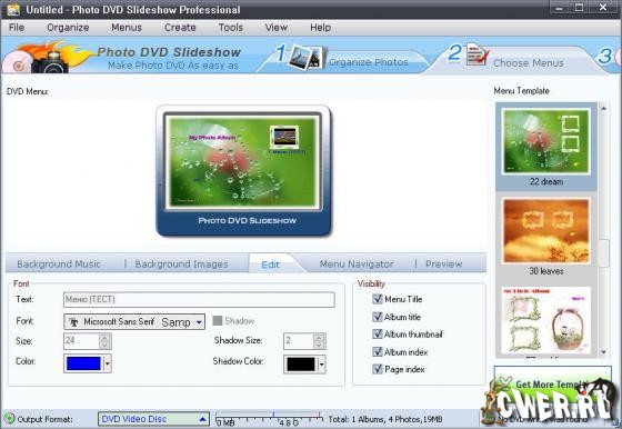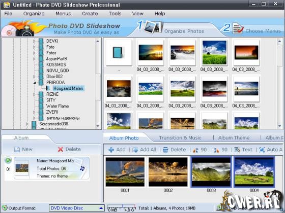 При помощи нескольких щелчков, программа создает потрясающие слайд-шоу фотографий с музыкальным сопровождением, CD или DVD меню, Pan&Zoom и эффектами перехода.