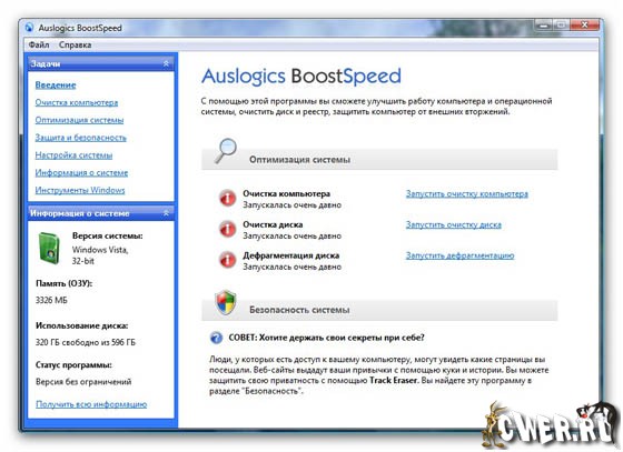 BoostSpeed - популярная утилита для ускорения работы системы Windows, программ и Интернет-соединения от компании AusLogics. Программа оптимизирует компьютерную память, ускоряет загрузку Windows, повышает быстродействие Microsoft Office, The Bat, FireFox, Opera, Skype, чистит реестр и диск компьютера. Четвертая версия программы включает в себя знаменитый Auslogics Disk Defrag и набор новых утилит для современных компьютеров. После дефрагментации реестра BoostSpeed, скорость компьютера возрастет за счет уменьшения фрагментации файлов реестра, уменьшения их размера, а также благодаря устранению ошибок в реестре. Помимо этого данная программа предлагает мощные возможности очистки реестра и диска, что в свою очередь позволит вашему компьютеру работать более быстро и эффективно. Имеет приятный пользовательский интерфейс и поддержку русского языка