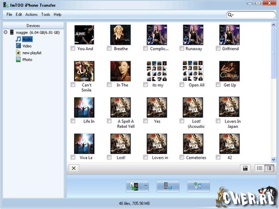 ImTOO iPhone Transfer - программа для обмена аудио и видео файлами между компьютером и Apple iPod проигрывателем. Позволяет передавать из компьютера в телефон, а также, в обратную сторону видео, музыку, любые файлы и делать бекапы телефона на PC.