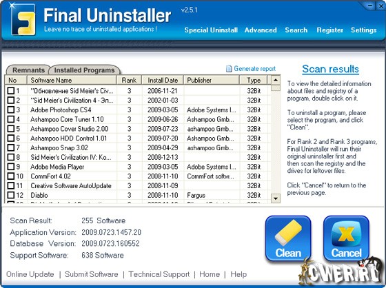 Final Uninstaller - программа позволяет очищать жесткий диск и системный реестр от мусора, оставшегося после удаления каких-либо программ. Программа использует высокоэффективный алгоритм обнаружения, который позволяет быстро просканировать систему и найти ненужные файлы и записи в системном реестре для каждой установленной программы на вашем компьютере. За несколько щелчков мыши программа просканирует ваш жесткий диск и реестр Windows, после чего предоставит вам список приложений, которые были неправильно деинсталлированы. После чего вы сможете выбрать приложения для последующего их полного удаления с компьютера. Программа имеет понятный пользовательский интерфейс и проста в использовании, поэтому подходит для любого пользователя.