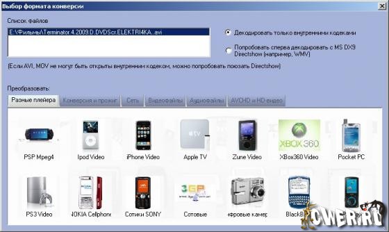 • Создавать мультимедийные материалы в популярных форматах (3GP, MP4, PSP, IPOD, SWF, FLV, DVD, SVCD, VCD, XVID, DIVX, VOB, AVI, ASF, WMV, AMR, MP3, AC3, OGG, WAV, WMA, AAC), пригодные для воспроизведения на портативных устройствах PDA, PSP, iPod, Zune, Xbox360 или сотовых телефонах.