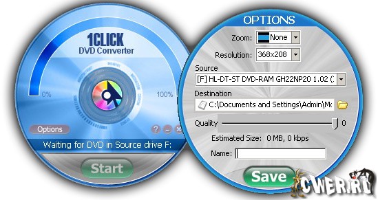 1CLICK DVD Converter конвертирует кинофильмы на DVD или отдельные эпизоды довольно быстро в видео файлы, пригодные для просмотра на таких медиа устройствах как: iPod, iPhone, Apple TV, Archos, Creative Labs Zen, Sony PSP, Generic DivX, Microsoft Zune. Программа успешно конвертирует любые типы дисков DVD и позволит вам наслаждаться DVD кинофильмами на вашем мобильном устройстве.