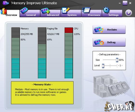 Позволяет увеличить быстродействие вашей системы за счет освобождения (дефрагментации) оперативной памяти. Имеется возможность установки минимального количество свободной оперативной памяти, при превышении которого запустится модуль и попытается удалить из оперативной памяти лишние процессы. Кроме этого, имеется возможность возможность просмотра запущенных процессов, наблюдение за нагрузкой на ЦП и множество других полезных настроек.