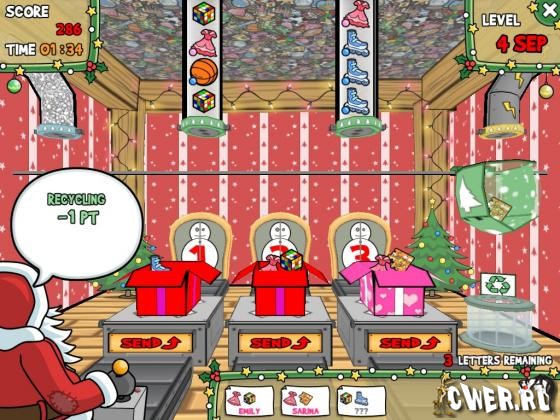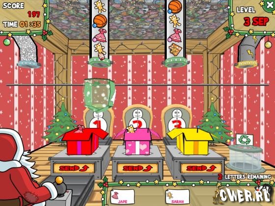 Помогите Санте упаковать и разослать подарки детишкам. Это легко: хорошую игрушку в хорошенькую коробку. Но внимательно читайте письма детей, чтобы не перепутать. И не забудьте вставить в электрические игрушки батарейки, а хрупкие бережно упаковать.