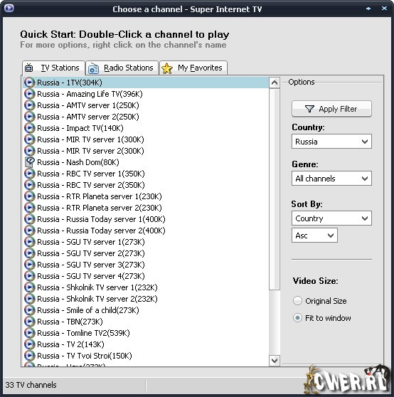 Super Internet TV позволяет смотреть прямые телевизионные каналы (более 2200), прислушаться к 5000 интерактивных радиостанций из 100 стран, а также более 200 вебкамер. Это программное обеспечение поставляется вместе с автоматическим обновлением телевизионной станции. При выборе программ рядом с тв-каналом стоит циферка на какой скорости и с каким качеством идёт данный канал. Нет необходимости иметь TV или FM тюнер все каналы передаются по сети Internet, для большинства каналов требуется лишь модемная или другая связь с пропускной способностью в 56 Kb/s.