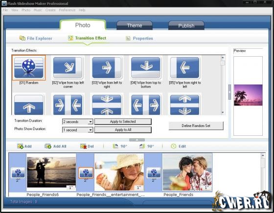 Программа для создания Flash - анимированного слайд - шоу из обычных цифровых фотографий. Предоставляет более 200 эффектов перехода одной фотографии в другую. Имеет различные темы внешнего оформления. Позволяет устанавливать музыкальное сопровождение.