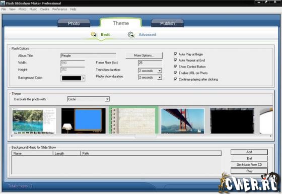 В настройках программы можно указать продолжительность показа отдельной фотографии и время ее перехода в другое изображение. Можно задать произвольный размер (в пикселях) готового flash - ролика. Полученный результат выводится в виде flash - файла и HTML - файла.
