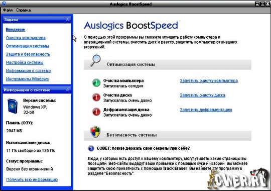 AusLogics BoostSpeed - популярная утилита для ускорения работы системы Windows, программ и Интернет-соединения от компании AusLogics. Программа оптимизирует компьютерную память, ускоряет загрузку Windows, повышает быстродействие Microsoft Office, The Bat, FireFox, Opera, Skype, чистит реестр и диск компьютера.