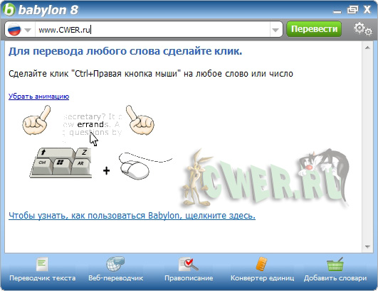 Babylon - словарь, позволяющий переводить слова с одного языка на другой. Работать со словарем очень просто: после нажатия кнопкой мыши (какой кнопкой - настраивается) на интересующее слово появляется окно с его переводом. Кроме перевода слов, Babylon включает в себя тематические и толковые словари, а также имеет функции конвертации валют на текущую дату и перевода мер из одной системы в другую.