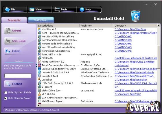 Uninstall Gold - программа для деинсталляции приложений, обладает большим количеством функций: показывает скрытые установленные программы, сортирует список программного обеспечения по заданному фильтру, удаляет некорректно инсталлированные и деинсталлированные программы.