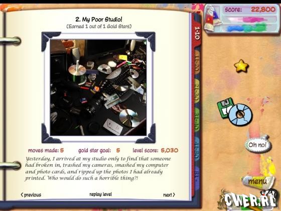 Красочная головоломка, не похожая ни на одну другую. Фиона - начинающий фотограф, она только что закончила сбор фотографий для свадебного альбома для своей лучшей подруги, Гвен. Но кто-то пробрался в студию и испортил все кадры уникальных фотографий! Помогите Фионе раскрасить фотографии и восстановить альбом, и схватите злоумышленника.