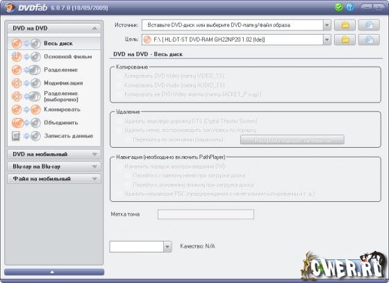 DVDFab – мощный, многофункциональный программный продукт для копирования DVD дисков с возможностями гибкой обработки видеопотока. Программа является одной из лучших на сегодняшний день, из инструментов для копирования, разбиения, пережатия и конвертирования DVD дисков с фильмами. Снимает все защиты и ограничения с диска и при желании пережмет диск большой емкости и вместит его в обыкновенную пустую DVD болванку с минимальными потерями качества (DVD9->DVD5) или разобъет фильм на два диска с полным переносом его меню, удалит всю рекламу, запишет только фильм и многое другое. Программа имеет интуитивно понятный, мультиязычный интерфейс включая русский.