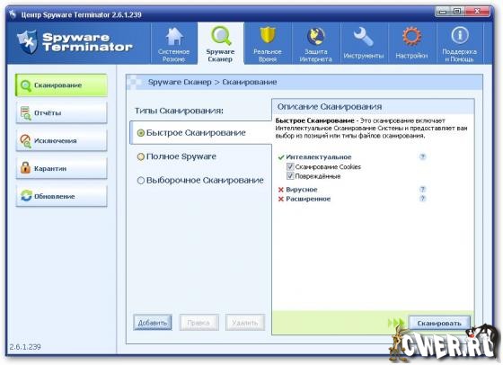Spyware Terminator - программа для защиты компьютера от различных вредных модулей - spyware, adware, кейлоггеров и других троянов. Имеет резидентный монитор, который в реальном времени проводит мониторинг системы и предотвращает попытки проникновения на компьютер вредоносного ПО. Кроме этого, имеющийся в программе сканер поможет отыскать и поместить в "карантин" или удалить уже внедренные объекты. Работает программа очень быстро... Spyware Terminator имеет опцию автоматического обновления своих баз через Интернет, а также умеет производить проверку по расписанию.