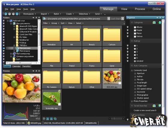 ACDSee Pro - профессиональная программа для работы с цифровыми фотографиями, которая обладает расширенным набором функций, рассчитанных на профессиональных фотографов. Поддерживает более 100 форматов графических файлов, позволяет работать с RAW-изображениями, автоматически сортировать фотографии по параметрам, полученным из цифровых фотокамер, содержит эффективный визуальный метод добавления к изображениям метатегов и быструю пакетную обработку большого количества картинок, в том числе и в RAW формате. Кроме того, здесь присутствуют инструменты для независимого регулирования цветовых каналов, исправления артефактов фотографий, появляющихся из-за погрешностей оптики, добавления "водяных знаков", работы с IPTC-метаданными, имеется возможность архивирования графических коллекций в ZIP-файлы, запись на CD или DVD и многое другое.