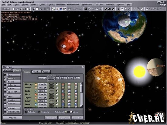 Этот мощный астрономический симулятор позволяет бороздить звездные просторы вдоль и поперек, обозревать Галактику с любого ракурса, производить любые замеры и вычисления, присутствовать при любых астрономических событиях прошлого и будущего, подходить к небесному телу на любое расстояние и даже вставать на его поверхность.