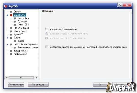 AnyDVD - предназначена для снятия защиты с любых DVD-дисков, так что вы сможете просматривать DVD-фильмы на компьютере с DVD-ROM, региональный код которого не соответствует этому DVD-диску. Даже если ваш привод не "обеззонен", у вас есть возможность копировать диски с любым региональным кодом напрямую с DVD-ROM на DVD±RW!
