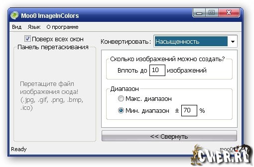 Moo0 ImageInColors позволяет легко конвертировать изображения в разные по оттенку, насыщенности и яркости в заданных Вами диапазонах желаемого количестве изображений.