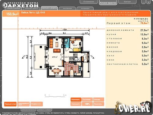 Проекты включают в себя: виды строения в 3-х измерениях, посадку строения на участке с размерами, поперечные поэтажные срезы здания с размерами и меблировкой, фотографии реализации проекта, точные размеры элементов здания с указанием типа и количества необходимых стройматериалов.