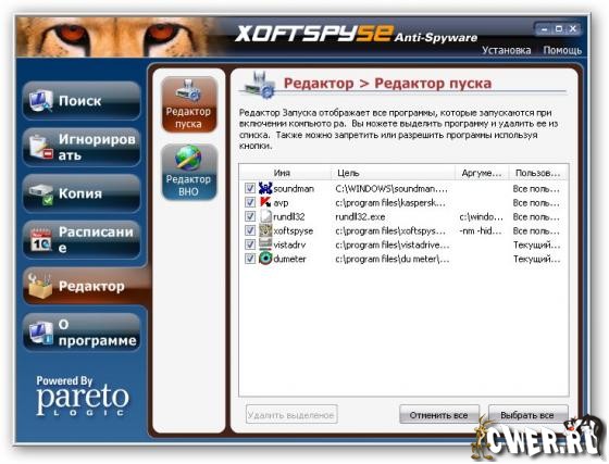 XoftSpySE Anti-Spyware не только находит разнообразные вредоносные модули, но и предоставляет исчерпывающую информацию о каждом из них. Присутствует возможность работы по расписанию. В XoftSpySE одна из самых больших баз данных: около 300000 определений.