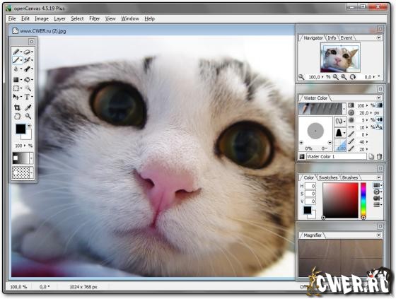 openCanvas - программа, дающая возможность художнику новичку/продвинутому с легкостью освоить компьютерную живопись. Это маленькая по размерам программа, с интуитивно понятным интерфейсом, без лишних наворотов, однако сочетает в себе основные достоинства таких гигантов СG (Computer Graphics), как Adobe PhotoShop и Corel Painter. Имеется палитра инструментов, основные фильтры, редактор кистей, в котором можно менять форму, чувствительность, твердость кисти, удобная палитра цветов и т.д. Особенно хорошо программа сочетается с графическими планшетами, поскольку реагирует на нажатия пера и его наклон. Т.к. программа была разработана японской компанией она, в основном, является инструментом мангаков и анимешников. Однако возможности программы практически не ограничены.