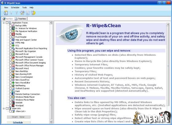 R-Wipe & Clean - эффективная утилита очистки дискового пространства и сохранения конфиденциальности информации. Это приложение полностью удалит временные интернет файлы, журнал посещенных страниц, кукисы, автозаполняемые формы и пароли, файлы подкачки, список недавно использовавшихся документов, список часто используемых компонентов, хранящихся в системном реестре, временные файлы и многое другое. Сделает невозможным восстановление конфиденциальной информации о вашей сетевой или локальной активности. Также программа удалит оставшуюся на компьютере информацию о работе более чем 200 приложений. Утратившие необходимость файлы и папки могут быть объединены в списки и удалены за один раз. Программой поддерживаются файловые системы FAT и NTFS. Различные задачи программы могут быть объединены в одну или более процедур и выполнены как сразу, так и в определенное время или при определенном событии в автоматическом режиме.