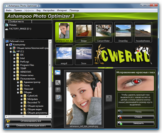 Именно поэтому Ashampoo Photo Optimizer необходим каждому, пользующемуся цифровой камерой. Программа открывает фотографии и показывает их в своем окне. Одного щелчка мышью достаточно для полной оптимизации снимка. И эффект от этой оптимизации вас впечатлит. С помощью Ashampoo Photo Optimizer снимки становятся ярче, светлее, приобретают четкость и контрастность. Если сравнивать показатели до и после преображения, заметно, насколько силен программный алгоритм оптимизации. Если ваши снимки неправильно расположены или перевернуты, вы легко повернете их всего одним щелчком мыши.