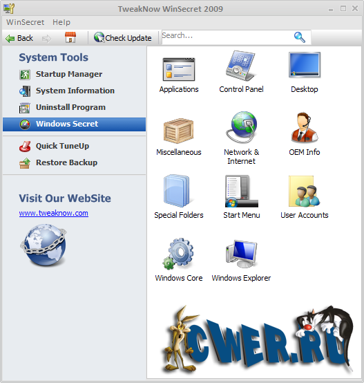 TweakNow WinSecret 2009 - утилита для тонкой настройки Windows. TweakNow WinSecret 2009 содержит наиболее востребованные параметры для изменения настроек операционных систем Windows XP/Vista/7. Все параметры разделены по категориям: приложения, панель управления, рабочий стол, сеть и Интернет, информация о компьютере, учетные записи пользователей, ядро Windows и различные другие настройки. Если работа программы приведет к нежелательным последствиям, то можно сделать откат, используя соответствующую функцию, что вернет все настройки на прежние.