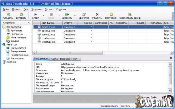 MetaProducts Mass Downloader - программа для удобного скачивания файлов из Интернета по протоколам HTTP и FTP, созданная на базе Offline Browser, разница только в том, что менеджер закачки загружает указанные пользователем файлы, а оффлайн-браузер - все файлы сайта. Программа разбивает закачиваемый файл на части и качает все части одного файла одновременно, тем самым увеличивая скорость. Может автоматически соединиться с провайдером, закачать файл и отключиться. Также позволяет докачивать файл после разрыва соединения (при условии, что сервер поддерживает докачку). Поддерживаемые протоколы HTTPS, FTP, RTSP, MMS, MMST и PNM. Имеется интеграция с веб браузерами Internet Explorer, Opera, Netscape Navigator, Mozilla, Firefox, Seamonkey и Flock. Программа имеет многоязычный интерфейс, включая русский язык и поддерживает работу с Windows Vista.