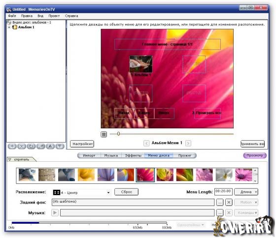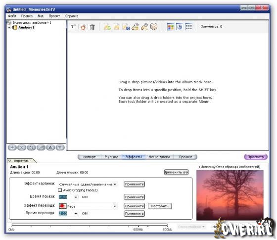 В нижней части рабочего окна MemoriesOnTV находится контекстно-зависимая панель. В ней может находиться файловый браузер, управление музыкальным оформлением, настройка спецэффектов и другое, связанное с текущим режимом работы программы. Чуть выше этой панели расположены кнопки переключения режимов работы. Чуть в сторонке, справа располагается кнопка включения предварительного просмотра проекта. Воспроизведение осуществляется в отдельном рабочем окне, напоминающем мультимедийный проигрыватель. Нижняя панель сворачивается и разворачивается с помощью закладки Hide/Show.
