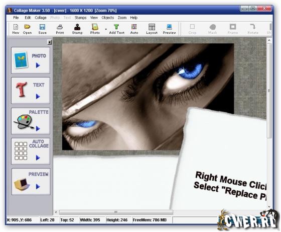 Collage Maker - удобная программа для быстрого создания коллажей. Возможности: создание веб-графики, фотоколлажей и других графических документов, более 80 готовых текстур, поддержка форматов JPG, BMP, TIFF, GIF, WMF, PSP, PSD, сохранение коллажей в JPG, GIF или BMP, маскирование/прозрачность, эффект падающей тени, контроль яркости/контраста, художественное оформление краев документа/фото, цветовые эффекты, преобразование фото в черно-белый вариант, поддержка WMF-формата, масштабирование/вращение фото, функции работы с текстом, функция сглаживания шрифтов и многое другое...