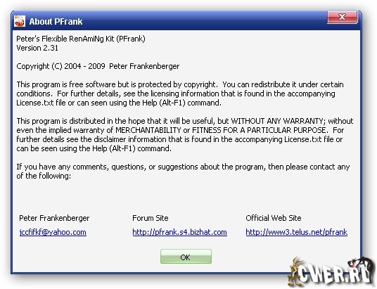 Pfrank - гибкая программа для переименования файлов (музыкальных файлов, картинок и т.д). Программа может изменять регистр букв, вставлять номера, вставлять названия папки, в которой расположены файлы, вставлять в название свойства файла, вставлять информацию из мета-тегов для музыкальных файлов, информацию EXIF для графических файлов и многое другое. Frank также имеет мощный движок регулярных выражений, а также уникальную опцию Path Builder, при помощи которой можно, например, превратить файл с названием 20061224abc.jpg в файл Newabc.jpg, который будет располагаться в папке 20061224.