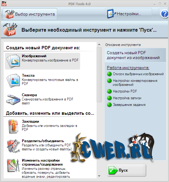 В комплекте с профессиональной версией PDF-XChange поставляется также PDF-Tools - инструмент для создания новых PDF-файлов из изображений и манипулирования имеющимися файлами. С помощью этого инструмента можно с легкостью объединять PDF-файлы, удалять из них страницы, извлекать отдельные фрагменты, изображения и текст, создавать и редактировать закладки, а также отправлять файлы по электронной почте и размещать их на серверах по протоколам HTTP и FTP.