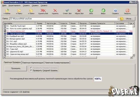 Sound Normalizer - звуковой нормализатор звука, предназначенный для повышения или восстановления уровня громкости музыкальных Wav и Mp3 файлов, причем отдельно по каждому каналу. Уровень громкости отображается в графическом виде с использованием процентного значения. Эта программа проста в использовании и даёт быстрые и превосходные результаты качественного звука. Имеется возможность пакетной обработки.
