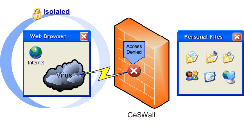 Once installed, GeSWall dynamically isolates web browsers, e-mail, chat, P2P, IRC clients and other applications that may serve as entry points for malicious software or intrusions. Viruses, trojans, spyware and exploits cannot pass through an isolated application and so cannot cause any damage.