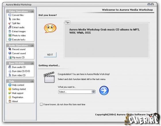 Aurora Media Workshop является программой, включающий в себя полный спектр средств для работы с видео и аудио файлами. Аудио и видеo конвертер, нарезка и соединение треков, граббер аудио CD, извлечение аудио из видео файлов, прожиг CD, создание видео CD из набора фотографий с множеством эффектов перехода, извлечение картинок (фреймов) из видео файлов, граббер DVD (VOB, DAT) в видео форматы, а аудио в MP3, WMA, WAV форматы, поддержка: AVI, MPEG1, MPEG2, ASF, WMV, VOB, DAT, DivX, XviD, MP3, WMA, WAV, OGG и других форматов.
