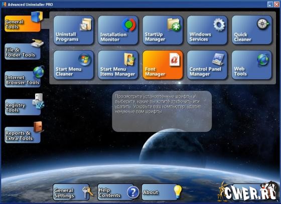 Advanced Uninstaller PRO - утилита для корректного и полного удаления программ с множеством дополнительных возможностей. Имеется Startup Manager, модуль управления программами, автоматически запускаемыми при загрузке системы, а также отображающий детальную информацию по каждой записи. Присутствует чистильщик реестра, оптимизатор системных ресурсов, дефрагментатор, модуль создания резервных копий и т.д. Также данная программа позволяет чистить кукисы, историю переходов и записи более, чем ста программ. Монитор инсталляций отслеживает изменения в системе и позволяет полностью «откатить» изменения, сделанные установленной программой. Имеется средство для оптимизации работы компьютера, путём грамотного управления запущенными сервисами.