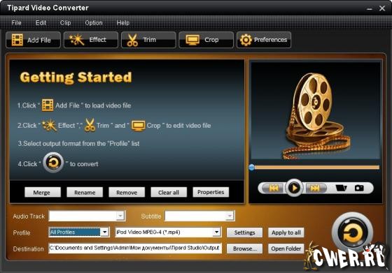 Tipard Video Converter - профессиональный конвертер видео файлов: MPG, MPEG, MPEG2, VOB, MOD, MP4, H.264, AVI, WMV и др. Также он может извлекать аудио из видео и конвертировать его в M4A, MP3, AC3, AAC, WMA, WAV, OGG. Конвертированные файлы могут использоваться на портативных плеерах PSP, iPhone (3G), iPhone, Zune, Zune 2, Blackberry, Creative Zen, Sony Walkman, iRiver PMP, Archos, PS3, Apple TV, Xbox, iPAQ, Pocket PC, Mobile Phone и др.