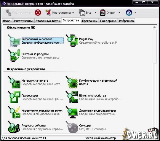 SiSoftware Sandra - это системный анализатор для 32-х и 64-битных версий Windows, включающий в себя тестовые и информационный модули. Sandra старается превзойти другие подобные утилиты и показать реальную картину, объединяя в одной программе возможности для сравнения производительности как на высоком, так и на низком уровне. Вы можете получить сведения о процессоре, чипсете, видеоадаптере, портах, принтерах, звуковой карте, памяти, сети, Windows, AGP, соединениях ODBC, USB2, Firewire, и других.
