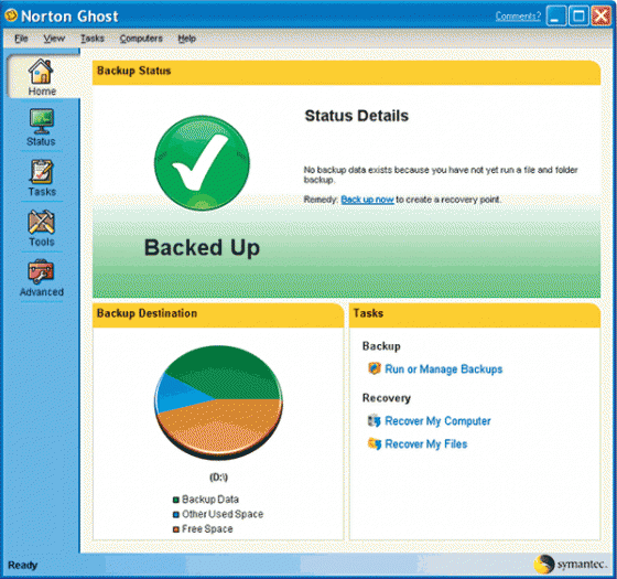 Программа позволяет создавать образ диска и производить архивацию и восстановление данных прямо в Windows, больше не требуется перезагрузка компьютера и дополнительные загрузочные дискеты. Программа может производить резервное копирование данных автоматически, а также записывать сохраненные данные на CD. От аналогов Norton Ghost отличается поддержкой добавочного резервирования (копируются только те файлы, в которые были внесены изменения). Norton Ghost также позволяет копировать резервные данные на CD, DVD, в локальных/сетевых системах хранения информации и внешних устройствах, подключаемых по интерфейсам USB 1.1, 2.0 и FireWire.