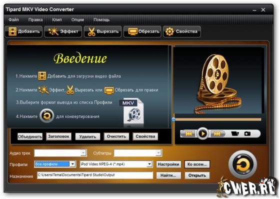 Tipard Video Converter - профессиональный конвертер видео файлов: MPG, MPEG, MPEG2, VOB, MOD, MP4, H.264, AVI, WMV и др. Также он может извлекать аудио из видео и конвертировать его в M4A, MP3, AC3, AAC, WMA, WAV, OGG. Конвертированные файы могут использоваться на портативных плеерах PSP, iPhone (3G), iPhone, Zune, Zune 2, Blackberry, Creative Zen, Sony Walkman, iRiver PMP, Archos, PS3, Apple TV, Xbox, iPAQ, Pocket PC, Mobile Phone и др.