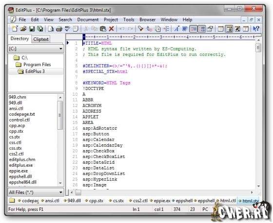 EditPlus - текстовый редактор, редактор веб-страниц и редактор программиста для Windows, ориентированный на интернет. Редактор может служить отличной заменой стандартному блокноту Windows, и, в то же самое время, имеет множество мощных и удобных возможностей для создателей веб-страниц, переводчиков программ, программистов и прочего населения земного шара. Основные возможности редактора включают в себя подсветку синтаксиса для различных типов файлов, панель инструментов HTML, пользовательские панели инструментов, номера строк, линейку, подсветку адресов интернета и электронной почты, авто-завершение, встроенные текстовые клипы, выделение столбцов, мощные поиск и замена, в том числе поиск определённой фразы в группе файлов, множественная отмена и восстановление, модуль проверки орфографии, настраиваемые горячие клавиши и многое другое. Этот редактор предназначен скорее для программистов, чем для обычных верстальщиком HTML страниц.